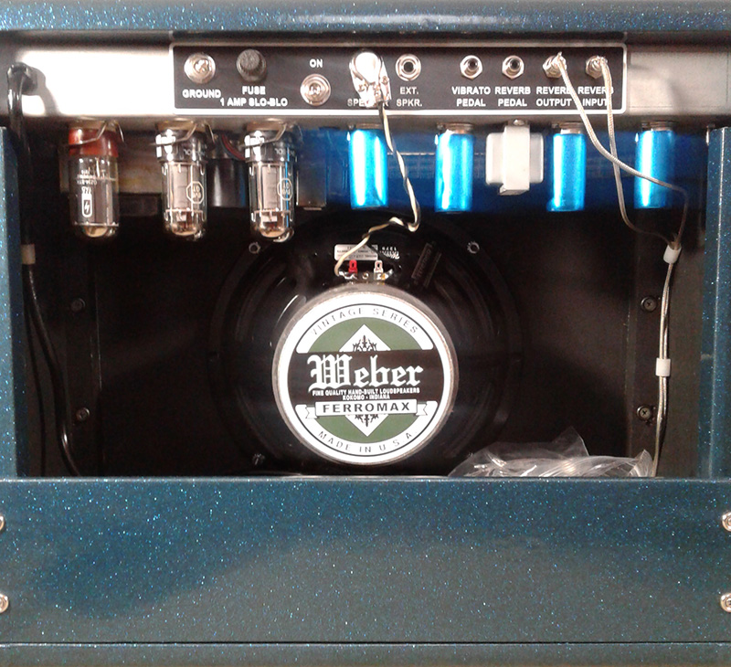 Based on the 60s Black Face Princeton Reverb circuit, but with increased tremolo depth, a slight increase in mids, and lows voiced to bloom into a sweeter breakup and avoid farting out when pushed. Handwired, point to point on eyelet board
